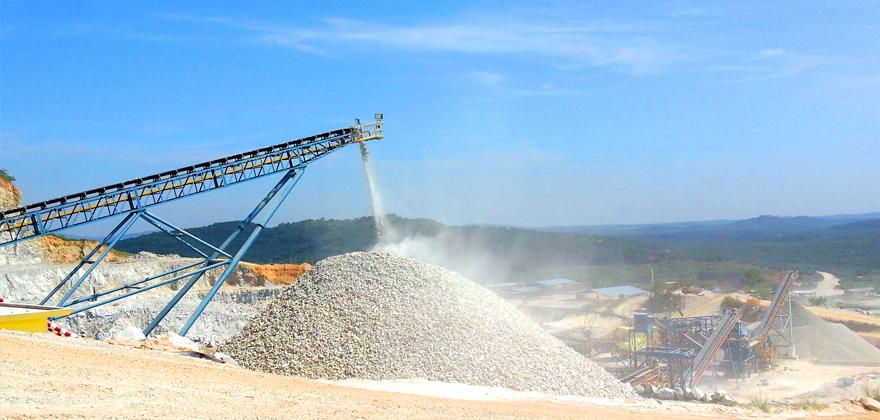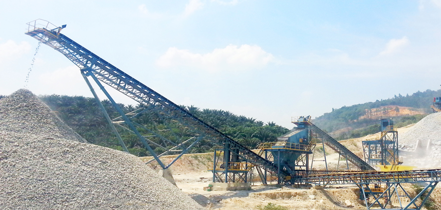 時產(chǎn)300-400噸石灰石(白云巖)類巖石的砂石骨料生產(chǎn)線,將經(jīng)過爆破處理或開挖洞采小于1160mm的毛料通過棒條給料機均勻的供給顎式破碎機破碎,經(jīng)顎式破碎機破碎后的半成品物料75-275mm,通過皮帶機輸送給反擊式破碎機進行二次破碎,經(jīng)反擊破二次破碎后的混合骨料經(jīng)過皮帶機輸送至后續(xù)一篩車間進行分級篩分,篩分過后將大于用戶需要的大顆粒物料再通過皮帶機重新返回反擊式破碎機循環(huán)破碎,篩分過后滿足客戶需要的不同顆粒級別的成品通過出料皮帶機輸送至成品料倉。如果成品砂需要水洗也可以配置洗砂機用于成品砂的水洗。