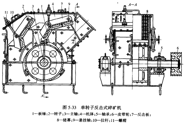 反擊式破碎機,因轉于的數(shù)目不同.分為單轉于和雙轉子兩種。單轉子反擊式破碎機的構造如圖5-33所示。