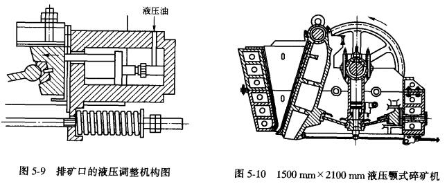 如圖5-9所示,在調(diào)整前,先松開連接滑塊座與后機(jī)架間的螺帽及拉桿彈簧螺帽,再啟動(dòng)油泵,向油缸充油,使活塞推動(dòng)滑塊座向前移動(dòng),然后在滑塊座與后機(jī)架間增減墊片,以調(diào)整徘礦口的大小,調(diào)整后將油卸出,擰緊滑塊座與后機(jī)架間的螺帽及重新調(diào)整拉桿彈簧的螺帽,至此排礦口的調(diào)整就已完成。