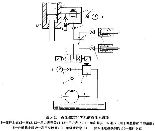 圖5-10是我國近年設(shè)計(jì)的液壓簡擺型顎式破碎機(jī),規(guī)格為1500mmx 2l00mm。是兼有液壓保險(xiǎn)裝置,液壓排礦口調(diào)整裝置,并能分段啟動(dòng)的新型設(shè)備。該設(shè)備的液壓系統(tǒng)如圖5-11所示。