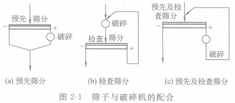 當(dāng)篩分作業(yè)和破碎作業(yè)配合進(jìn)行時(shí)稱為輔助篩分。若用也破碎的把合格粒級(jí)預(yù)先篩出叫預(yù)先篩分;若用在破碎后以控制破碎產(chǎn)品的粒度則叫檢查篩分。預(yù)先篩分的目的是為了避免物料的過粉碎,從而提高破碎設(shè)備的生產(chǎn)能力和減少功力消耗。檢查篩分的目的是從破碎設(shè)備的產(chǎn)物巾將粒度不合格的大塊篩出,以保證產(chǎn)品不超過要求的粒度上限,如圖2-1所示。