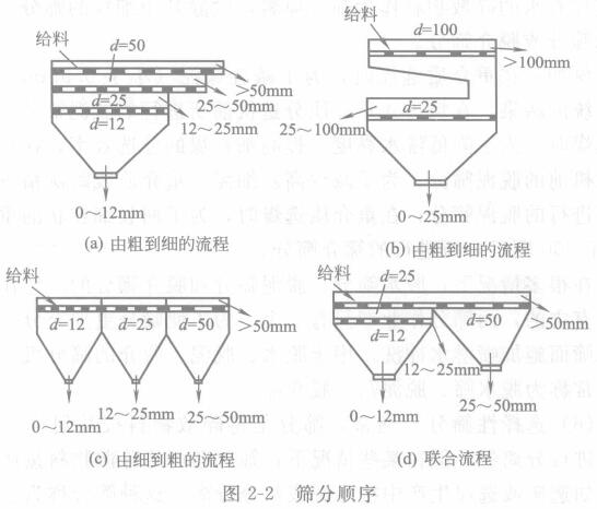混合篩分。在聯(lián)合流程中,一部分篩面由粗到細(xì)排列,另一部分篩面由細(xì)到粗排列,如圖2-2(d)。在生產(chǎn)實(shí)踐中,通常使用由粗到細(xì)或聯(lián)合的篩分流程。