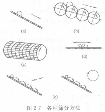 (1)滑動(dòng)式篩分法:物料在斜置固定不動(dòng)的篩面上靠本身自重下滑。這是早期使用的篩分方法,其效卒低、產(chǎn)量小,如圖2-7(a)。