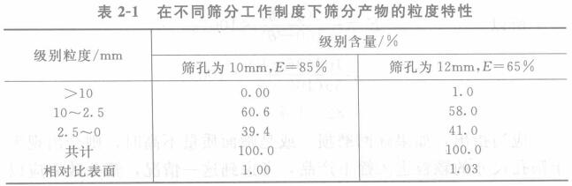 篩分過程是不平衡的,“難篩顆?!蓖ㄟ^篩孔慢,細(xì)粒通過篩孔快,由于這種不平衡,就可以利用加大篩孔尺寸降低篩分效率的辦法來提高篩子的生產(chǎn)率。例如,短頭圓錐破碎機(jī)和篩子構(gòu)成閉路破碎中硬礦石時(shí),破碎機(jī)固定排礦口10mm、檢查篩分合兩種不同的工作制度;①篩孔為10mm,總篩分效率為85%;②篩孔為12mm,總篩分效率為65%。實(shí)際上這兩種工作條件所得到的篩下產(chǎn)物有著等值的比表面,即相同的平均粒度(見表2-1),也就是說,篩下產(chǎn)物對磨礦而言是“等值”的,也叫“等值篩分”。