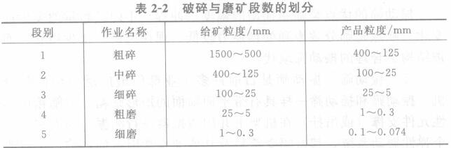 礦石的破碎和磨碎是選別前的準(zhǔn)備作業(yè)。選礦的前提條件是要使礦石中的有用礦物達(dá)到單體分離。由于有用礦物以單體存在的粒度是很小的,有時(shí)需要將礦石磨細(xì)到小于0.074mm占80%的細(xì)度,甚至還要細(xì)些,才能使某種有用礦物達(dá)到單體分離。從采場(chǎng)山來(lái)的礦石塊度很大,如露采的供礦塊度最大可達(dá)1000mm左右,所以要把大于1000mm的礦塊破碎到只有幾十微米的細(xì)度,往往要分幾個(gè)階段才能完成。以破碎來(lái)說(shuō),在大型選礦廠一般采用粗、中、細(xì)三段破碎(也有采用四段的),使礦塊的粒度逐漸縮小到8-25mm左石,然后再送到磨礦機(jī)進(jìn)行研磨。直到有用礦物顆粒能達(dá)到單體分離為止。磨礦通常是一段或兩段。破碎與磨礦的段數(shù)劃分大致見表2-2所列。
