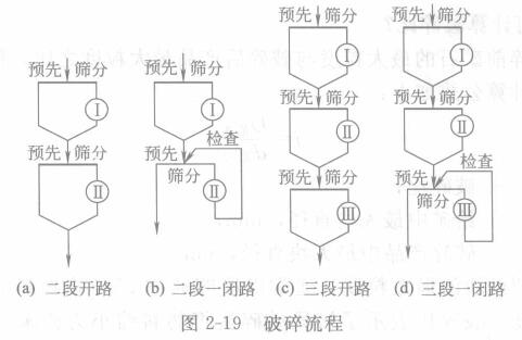 如圖2-19(b)所示;當(dāng)小于300mm的原礦,經(jīng)第一次預(yù)先篩分(若篩孔為75mm),得到75-0mm的篩下產(chǎn)物不必經(jīng)第一次破碎,只有300-75mm的篩上產(chǎn)物進(jìn)人破碎機(jī)中,然后把第一次預(yù)先篩分的篩下產(chǎn)品和第一次破碎后的產(chǎn)品合并在一起,進(jìn)行第二次預(yù)先篩分(篩孔為15mm),得到15-0mm的篩下產(chǎn)品,這就是碎礦的最終粒度,即合格粒度。篩上產(chǎn)品粒度為75-15mm,并把它進(jìn)行第二次破碎,破碎產(chǎn)品還要經(jīng)檢查篩分(通常把預(yù)先篩分的檢查篩分合并在同一作業(yè),叫預(yù)先檢查篩分)。大于15mm的不合格產(chǎn)品繼續(xù)破碎,直到粒度符合要求為止。