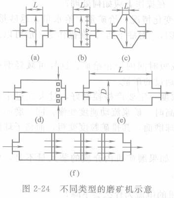 ②長(zhǎng)筒型磨礦機(jī):在其內(nèi)部又分為幾個(gè)室,稱多室磨礦機(jī),一般多用于水泥工業(yè)。如圖2-24(e)、(f)所示。