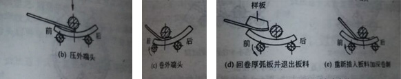 3、按箭頭方向回卷兩板,使厚弧板偏心放置(前多后少),預(yù)彎頭板脫床,并用樣板檢查曲率,若弧欠時(shí)可再次插入卷制,直至達(dá)到理想弧。(如圖d e)