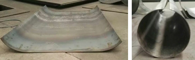 此方法在NHX500選粉機(jī)制作中得到檢驗(yàn),收到良好效果,預(yù)彎成品如圖1、圖2。對(duì)于日常制作過(guò)程中較薄板的卷圓件可采用此方法(3~6mm),既能節(jié)約材料,又能提高效率,保證質(zhì)量。